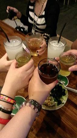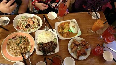 走走拍拍之間,泰式料理店也到了,而且裡面幾乎已經快坐滿人了,老闆將我們安排在最裡面的小空間,有點像包廂式的,長桌加上長椅,別有風味。點餐一樣是Share的方式,點幾樣菜大家一起吃,我們點了海鮮涼拌、泰式蝦湯、炒泡麵、咖哩雞肉飯、打拋豬肉飯、炸雞腿、泰式奶茶、檸檬紅茶,其他人說味道不夠道地,但我覺得每一樣東西都好好吃,不過泰式料理的特色就是辣,讓我這一頓飯吃的是汗狂冒啊,還好有一杯泰式奶茶,喝了一口小袁的檸檬茶,我都覺得好好喝,我愛。