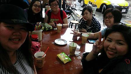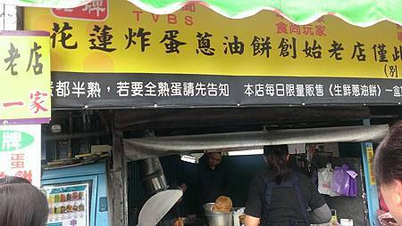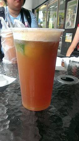 超商對面就是有名的蔥名餅街,都千里迢迢來到花蓮了,蔥油餅就近在眼前,不去買個試試不是太對不起自己了嗎?因為還要留肚子吃別的東西,所以我們六個人只點兩份炸蛋蔥油餅,一旁的飲料店家也來跟我們推銷檸檬茶,雖不知好不好喝,但還是一致通過,一樣點了兩杯來試試。