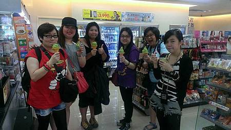 連著三天說要帶她們去吃全家季節限定的抹茶霜淇淋,但經過的全家都剛好沒有販賣,吃完泰式料理出來,就看到路口的全家有在賣霜淇淋,天氣又熱,就立馬進去一人買了一支消暑,順便請店員幫我們拍照,大家就坐在外面圓桌吃起冰來,我一開始還考慮自己要不要買抹茶的,因為照我以前的印象,抹茶口味的食物就是苦苦的,而我怕苦啊,但天氣真的很熱,買一個試試吧,沒想到味道還不錯耶。